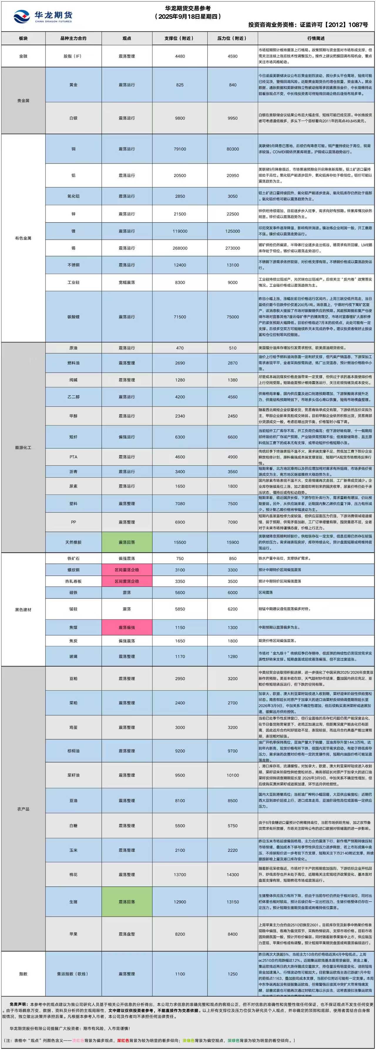 宏观面:今日凌晨美联储宣布将联邦基金利率目标区间下调25个基点到4.00%至4.25%之间。这是美联储2025年第一次降息,也是继2024年三次降息后再次降息。此次决议以11票赞成、1票反对获得通过,唯一持不同意见的理事米兰(Stephen Miran)主张一次性降息50个基点。美联储在最新经济预测中还暗示,年内可能会再有两次降息。美联储主席鲍威尔在会后新闻发布会上表示,就业担忧盖过通胀压力,就业市场走弱是促使美联储启动降息的主要原因。“劳动力需求已经放缓,就业增长的步伐低于维持失业率稳定所需的水平。”他说,劳动力市场不再“非常稳健”。会议和鲍威尔发言意外引发黄金市场的剧烈震荡。现货黄金价格从盘中触及的纪录高位3707.35美元迅速回落,周三收跌0.8%至每盎司3659.79美元,跌幅近1%。黄金作为传统避险资产,今年迄今已累计上涨39%,本月涨幅更是逾6%。美联储的“点阵图”预测显示,今年剩余两次会议还将各降息25个基点,将政策利率区间拉至4.00%-4.25%,这比6月的预期更鸽派,隐含着对滞胀风险的缓解。