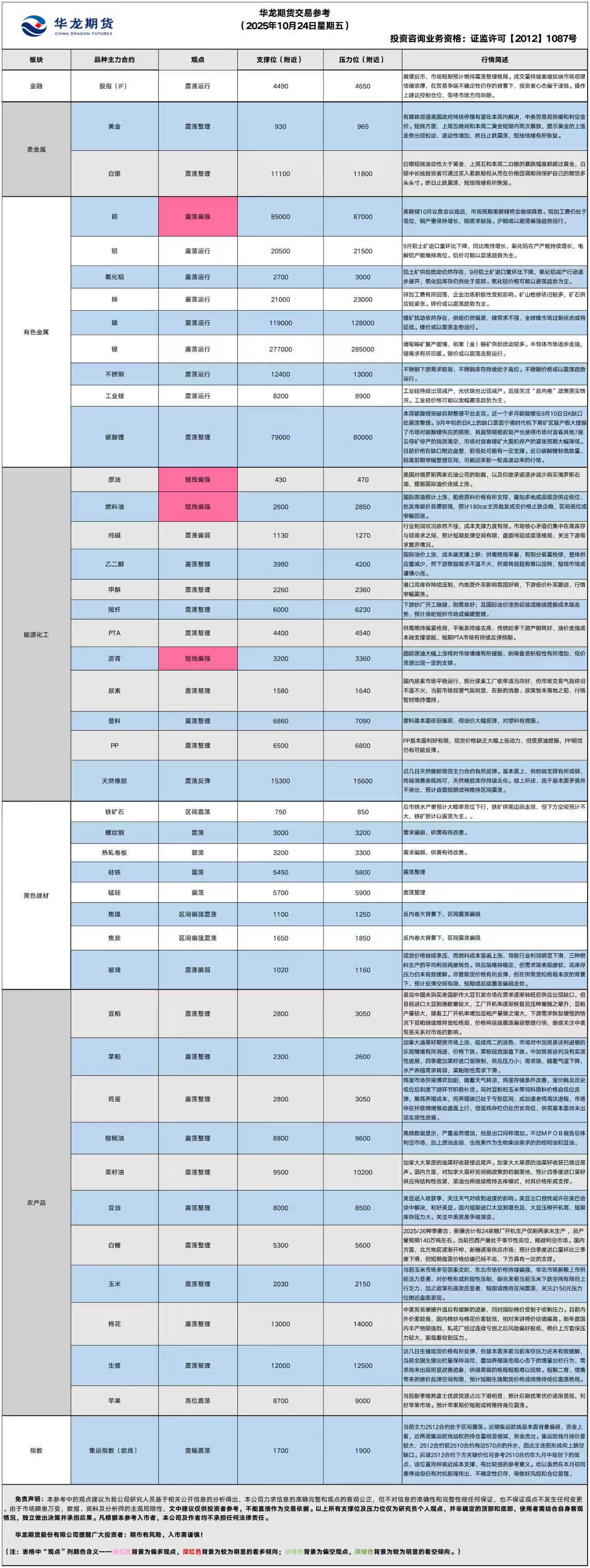 华龙期货每日策略参考(2025.10.24)