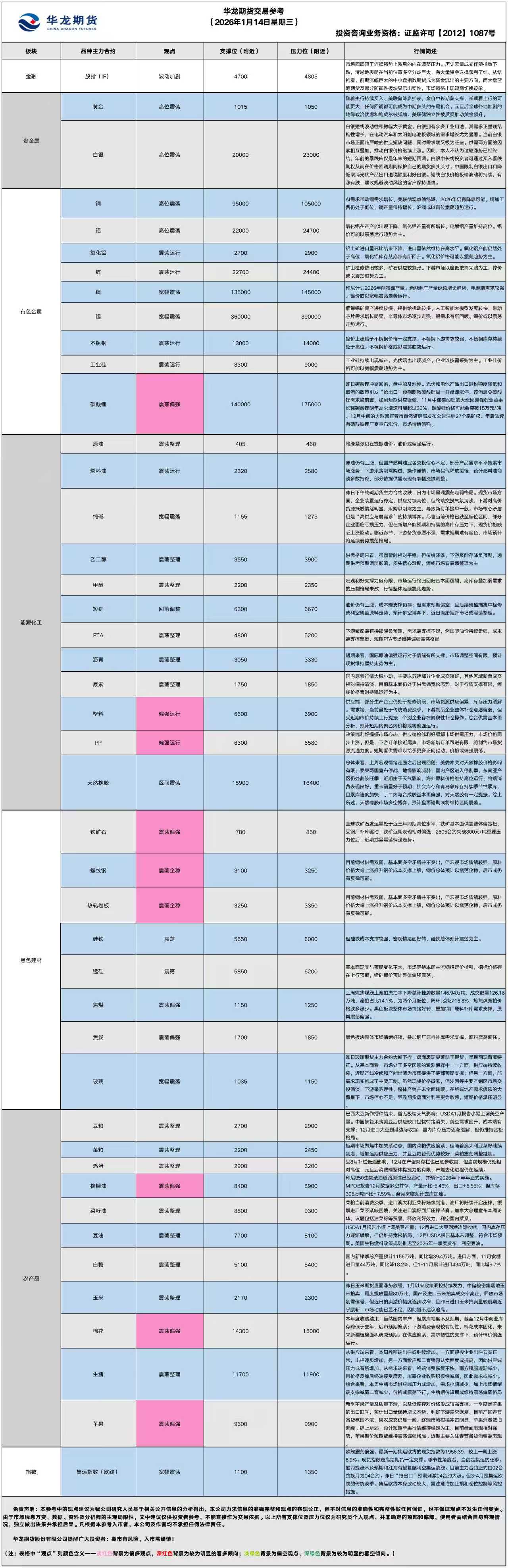 宏观面:美国12月CPI同比为2.7%,与11月持平并符合预期;CPI环比上升0.3%。更受市场关注的核心CPI(剔除食品与能源)环比上升0.2%,低于市场预期的0.3%;核心CPI同比为2.6%,同样低于预期的2.7%,并被描述为自2021年3月以来的最低水平。报告还显示,能源价格有所缓和(受汽油价格回落带动),但食品价格依旧偏高,意味着生活成本压力并未完全消退。数据公布后,美国短期利率期货大幅上涨 ,交易员们进一步增加了对美联储降息的押注。尽管交易员们仍认为,6月降息是最可能的结果, 但4月降息的概率升至42%,高于数据发布前的38%。市场普遍预期美联储在1月27-28日议息会议上大概率维持利率不变。特朗普再次强调应“显著”降低利率。