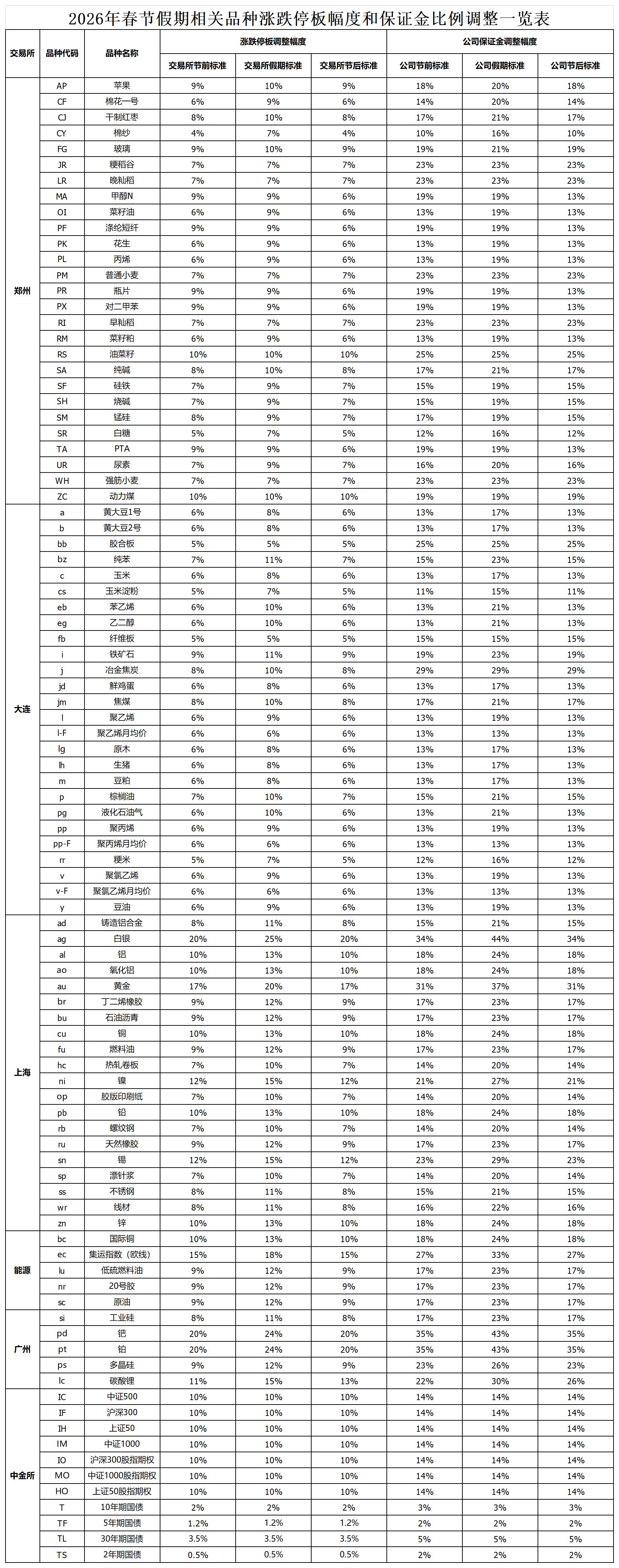 2026年2月24日(周二)恢复交易后,各交易所调整如下: 1、郑州商品交易所:自品种持仓量最大的合约未出现涨跌停板单边市的第一个交易日结算时起,甲醇期货2603合约的涨跌停板幅度为8%;甲醇期货2604、2605合约的保证金标准较节前下调4%,涨跌停板幅度为8%;对二甲苯期货2603合约的涨跌停板幅度为7%;对二甲苯期货2604、2605合约的保证金标准较节前下调5%,涨跌停板幅度为7%;PTA期货2603合约的涨跌停板幅度为7%;PTA期货2604、2605合约的保证金标准较节前下调5%,涨跌停板幅度为7%;短纤期货2603合约的涨跌停板幅度为7%;短纤期货2604、2605合约的保证金标准较节前下调5%,涨跌停板幅度为7%;瓶片期货2603合约的涨跌停板幅度为7%;瓶片期货2604、2605合约的保证金标准较节前下调5%,涨跌停板幅度为7%;苹果期货2603、2604、2605合约的保证金保持假期标准,涨跌停板幅度为10%;锰硅期货合约的保证金标准较节前下调2%,涨跌停板幅度为7%;其他品种期货合约的交易保证金标准和涨跌停板幅度恢复至调整前水平。 2、大连商品交易所:在各品种持仓量最大的合约未出现涨跌停板单边无连续报价的第一个交易日结算时起,各品种期货合约涨跌停板幅度和保证金水平恢复至节前标准。 3、上海期货交易所:自第一个未出现单边市的交易日收盘结算时起,所有已上市期货合约的涨跌停板幅度和保证金比例恢复至原有水平。 4、上海国际能源交易中心:自第一个未出现单边市的交易日收盘结算时起,所有已上市期货合约的涨跌停板幅度和保证金比例恢复至原有水平。 5、广州期货交易所:在各品种期货持仓量最大的合约未出现涨跌停板单边无连续报价的第一个交易日结算时起,碳酸锂期货合约的涨跌停板幅度调整为13%,保证金比例较节前上调4%;其他各品种期货合约的涨跌停板幅度和保证金标准恢复至调整前水平。