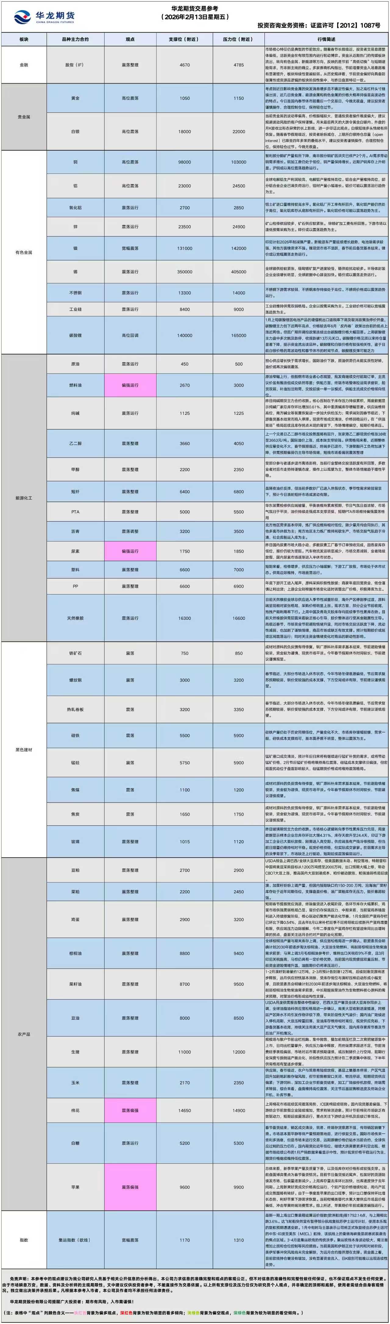 华龙期货每日策略参考(2026.02.13)