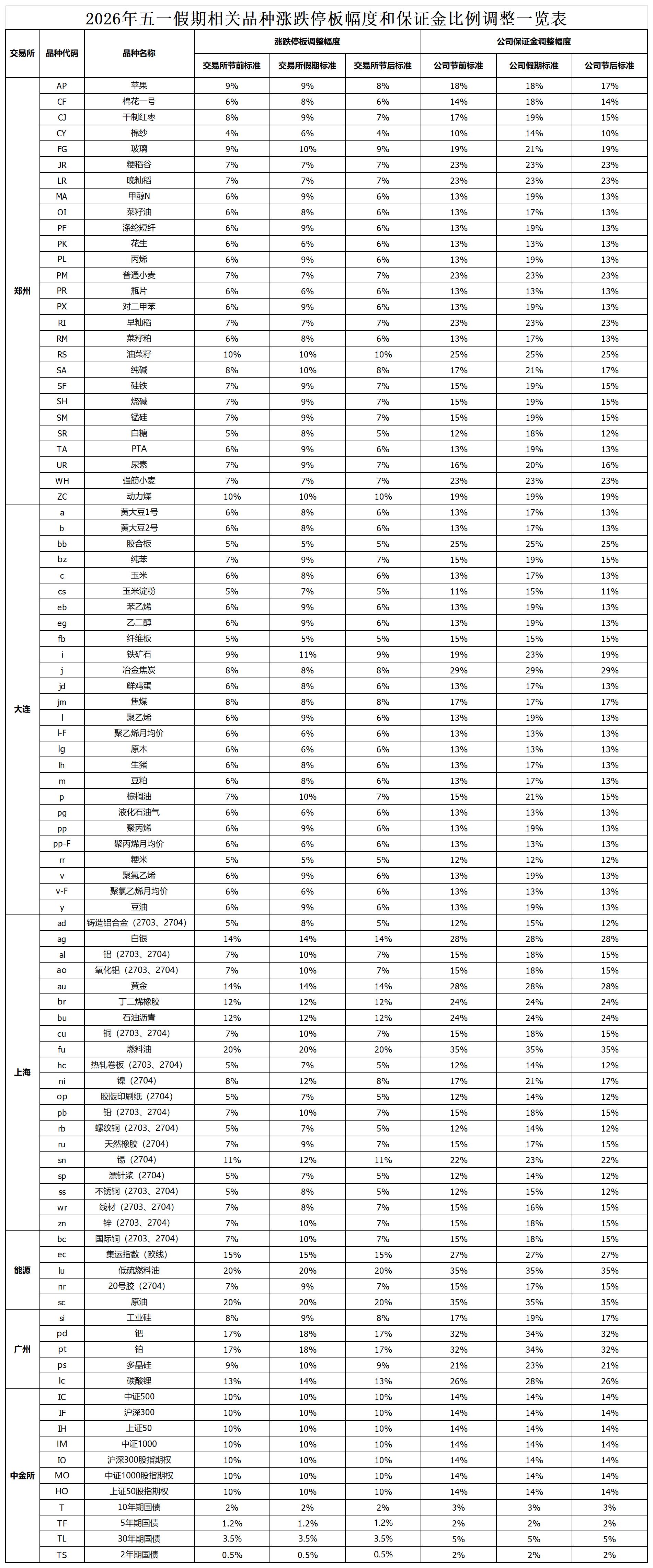 因劳动节假期,我公司于2026年4月28日(星期二)结算时起提高部分期货品种及合约保证金1%-6%,调整详情见附件。如遇保证金比例、涨跌停板幅度与执行的保证金比例、涨跌停板幅度不同时,则按两者中比例高、幅度大的执行。